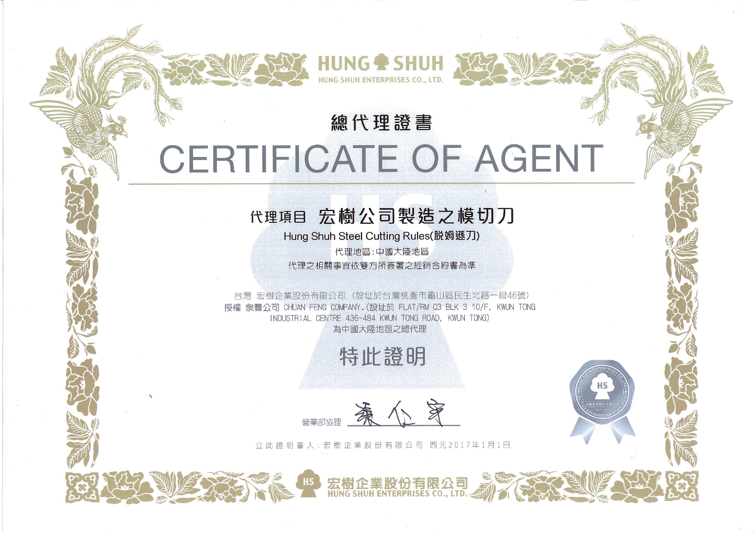 台灣 宏樹企業股份有限公司(設址於台灣桃園市山区民生北路一段46號)授權 泉豐公司 CHUAN FENG COMPANY.(設址於 FLAT/RM Q3 BLK 3 10/F,KWUN TONG INDUSTRIAL CENTRE 436-484 KWUN TONG ROAD, KWUN TONG)為中國大陸地區之總代理